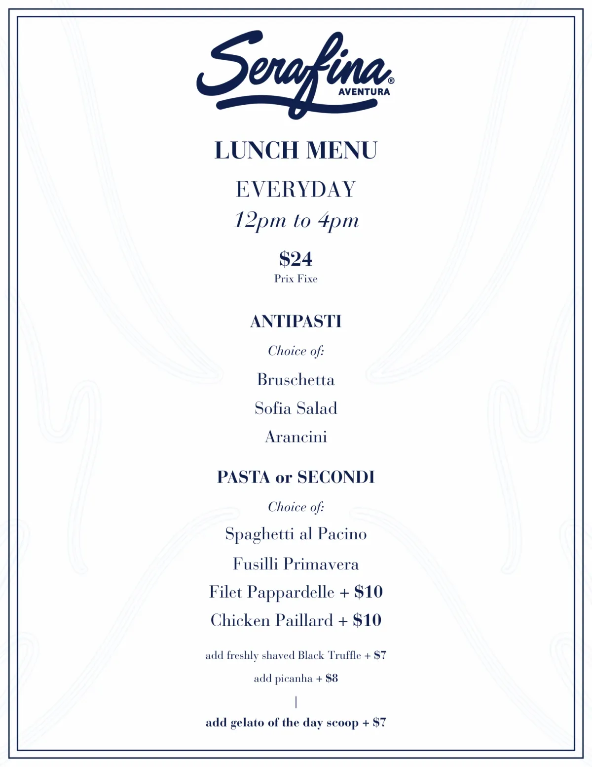 Step away from the ordinary and indulge in a beautifully paced lunch experience designed to satisfy without overwhelming. Whether you're meeting friends, hosting a client, or taking a well-deserved break, Serafina offers the perfect setting to make your afternoon feel special.